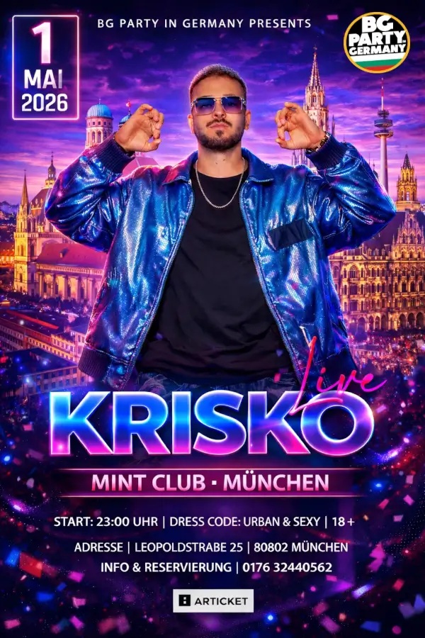 Популярният български изпълнител Криско ще гостува в Мюнхен на 1 май 2026 г. за специално клубно участие в Mint Club. Събитието се организира от BG PARTY IN GERMANY и се очаква да събере българи от цяла Германия.